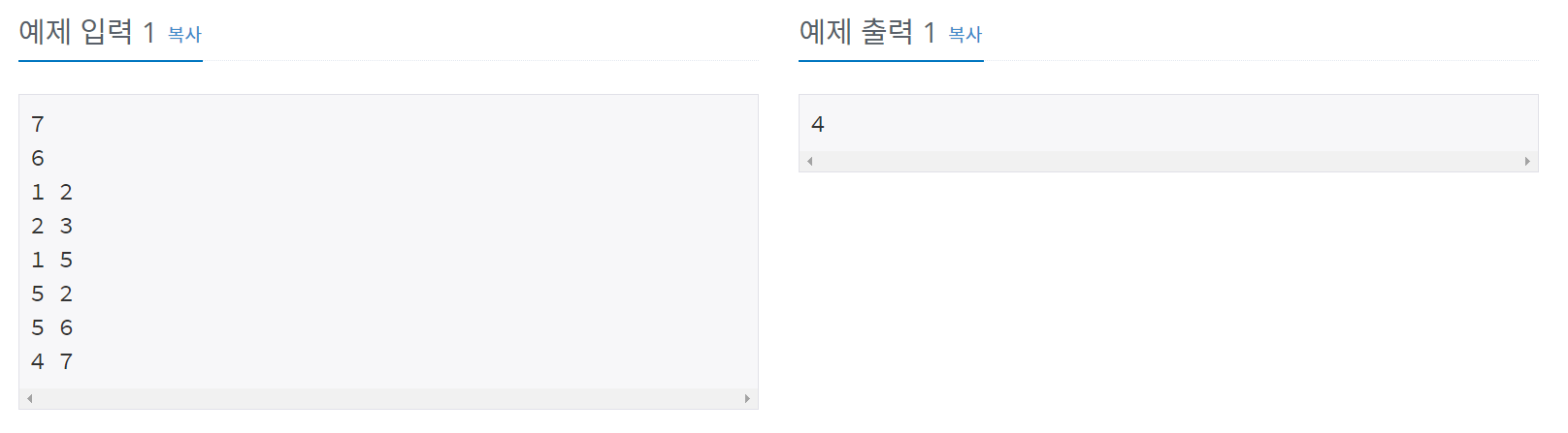 첫째 줄에는 컴퓨터의 수가 주어진다. 컴퓨터의 수는 100 이하이고 각 컴퓨터에는 1번 부터 차례대로 번호가 매겨진다. 둘째 줄에는 네트워크 상에서 직접 연결되어 있는 컴퓨터 쌍의 수가 주어진다. 이어서 그 수만큼 한 줄에 한 쌍씩 네트워크 상에서 직접 연결되어 있는 컴퓨터의 번호 쌍이 주어진다.